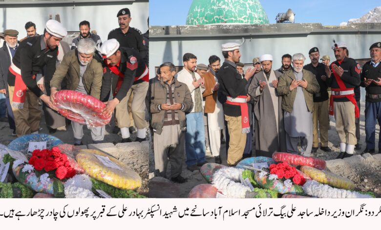 سکردو(پناہ نیوز)نگران وزیر داخلہ گلگت بلتستان ساجد علی بیگ نے ڈپٹی کمشنر سکردو اور اسسٹنٹ کمشنر سکردو کے ہمراہ ترلائی مسجد اسلام آباد بم دھماکے میں شہید ہونے والے انسپکٹر بہادر علی کے گھر جا کر ان کے والد اور دیگر لواحقین سے تعزیت کی۔ اس موقع پر انہوں نے شہید کے ایصالِ ثواب کے لیے فاتحہ خوانی کی اور درجات کی بلندی کے لیے خصوصی دعا کی۔نگران وزیر داخلہ نے کہا کہ انسپکٹر بہادر علی کی شہادت پر پوری قوم کو فخر ہے۔ انہوں نے کہا کہ حکومتِ پاکستان اور پاک فوج فتنہ الہندستان اور فتنہ الخوارج کے ناپاک عزائم کو خاک میں ملائیں گے اور وطنِ عزیز پاکستان کو دہشت گردی سے پاک کریں گے۔ انہوں نے اس عزم کا اعادہ کیا کہ شہید کا لہو رائیگاں نہیں جائے گا۔انہوں نے اعلان کیا کہ بینظیر چوک تا کلفٹن پل روڈ کو شہید بہادر علی روڈ سے منسوب کیا جائے گا تاکہ شہید کی قربانی کو ہمیشہ یاد رکھا جا سکے۔بعد ازاں نگران وزیر داخلہ نے شہید انسپکٹر بہادر علی کی قبر پر حاضری دی، پھولوں کی چادر چڑھائی اور شہید کے درجات کی بلندی کے لیے دعا کی۔